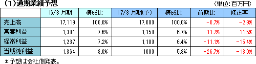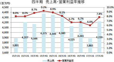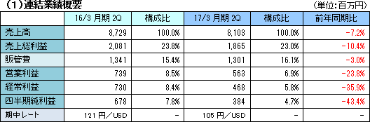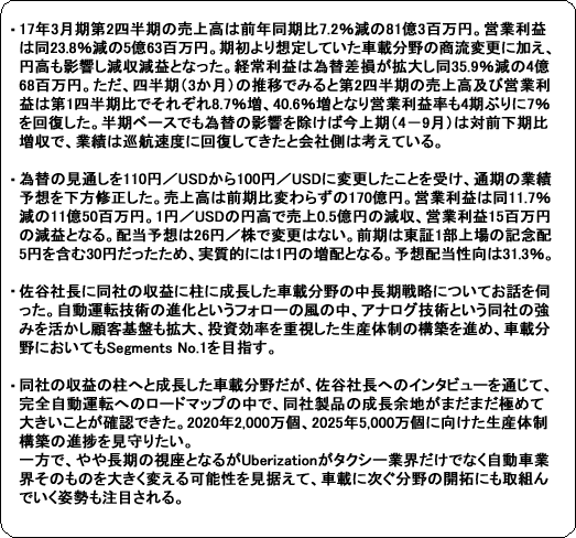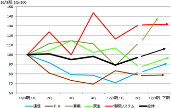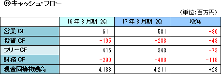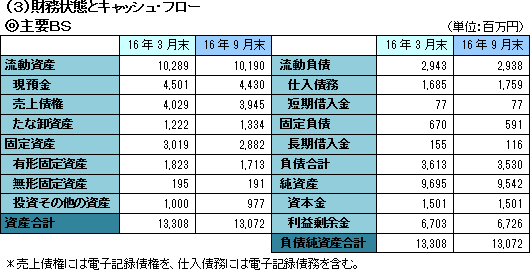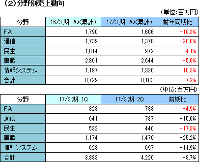 売上高は前年同期比7.2%減の81億3百万円。営業利益は同23.8%減の5億63百万円。期初より想定していた車載分野の商流変更(タイに販社を設立したため代理店が保有していた在庫が同社の在庫に計上)に加え、円高も影響し減収減益となった。経常利益は為替差損が拡大し同35.9%減の4億68百万円となった。 ただ、四半期(3か月)の推移でみると第2四半期の売上高及び営業利益は第1四半期比でそれぞれ8.7%増、40.6%増となり営業利益率も4期ぶりに7%を回復した。 また、半期ベースでも為替の影響を除けば今上期(4-9月)は対前下期比増収で、固定費減、合理化などで体質強化が進み実質的には2割の増益となり、業績は巡航速度に回復してきたと会社側は考えている。 ![]() ![]() 中国におけるスマートフォン設備投資がピークアウトしたことに加え工作機械の受注減でマイナスとなった。 *通信 国内FTTH向け在庫調整が終了し反転に向かっている。 *民生 リオ五輪向け大型モニタの納入が第1四半期で完了し、またCMOSセンサー調達難でデジタルスチルカメラが減産となり低調に終始した。 *車載 商流変更(マイナス2.5億円の影響)が完了した。車載カメラが対前年同期比2割の数量増と拡大が続いている。 *情報システム 堅調な市場に加え大口案件が寄与し半期で過去最高売上となった ![]() 仕入債の増加、長期借入金の減少等で負債合計は同ほぼ変わらず。 円高により為替換算調整勘定がマイナスに転じたことなどから純資産は同1億53百万円減少し、95億42百万円となった。 自己資本比率は前期末比0.2%上昇し、73.0%となった。 ![]() 配当金の支払額増加により、財務CFのマイナス幅は拡大した。 キャッシュポジションは上昇した。 |