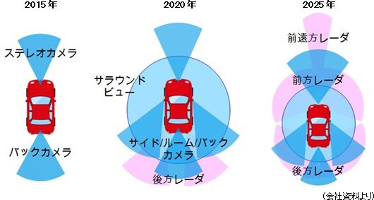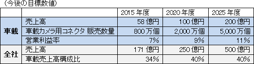 長年培ってきた堅牢性や長期信頼性というハードの強みに、少量短納期、カスタマイズに加え、コネクタに付随する適切なハーネスもあらかじめ接続するワンストップ受注といった「サービス」を融合させ、顧客満足度を引上げる。世界的にIoT、4Kや8Kの高画質化ニーズが高まる中、通信分野(海外における光通信化)、FA分野(グローバルな生産性向上ニーズ)、業務分野(セキュリティニーズ)において、堅牢性や長期信頼性といったノウハウの展開や高速POFによる市場創出により、通信分野やFA分野で規模と収益性を堅持する。 ![]() ②車載用コネクタ Segments No.1 戦略:ADASコネクタへ進化させ、将来価値を倍化