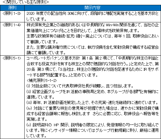 金融庁と東京証券取引所により策定された「コーポレートガバナンス・コード」が2015年6月1日から適用されるのに先立ち、2015年5月22日、「コーポレートガバナンス基本方針」を公表した。株主を始めとした全てのステークホルダーとの信頼関係構築のためのコーポレートガバナンスの重要性を深く認識したうえで、最良のコーポレートガバナンスを実現することが自社の責務であると宣言している。 (4)事業戦略