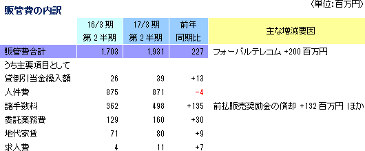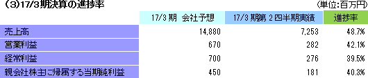 売上高は前年同期比9.1%増の72億53百万円。売上面は、新サービス(光コラボ・AmaVo)の拡大によりIP&Mobileソリューション事業で増加した。一方、前期の大型案件が終了した影響によりドキュメント・ソリューション事業で、更に、保険業法の改正の影響を受けたコンサルティング事業で減少した。営業利益は同14.0%減の2億82百万円。収益性の高いストック収益が増加したIP&Mobileソリューション事業で増加したものの、大型案件が終了した影響よりドキュメント・ソリューション事業と保険業法改正に対応するコストが増加したコンサルティング事業で減少した。売上総利益率は、30.5%と前年同期比0.1ポイント低下した。また、ISPサービスの獲得に伴う営業費用(販売コミッションの償却費)の増加や光コラボ関連の業務委託費の増加などにより、売上高対販管費比率は、26.6%と同1ポイント上昇した。また、営業外費用で貸倒引当金繰入額41百万円を計上したことなどにより経常利益は同21.3%減の2億76百万円と営業利益の減益率を上回った。その他、特別損益の大きな計上はなかった。 ![]() ![]() ![]() ![]() IP&Mobileソリューション事業 売上高52億76百万円(前年同期比18.7%増)、セグメント利益1億25百万円(同233.5%増)
