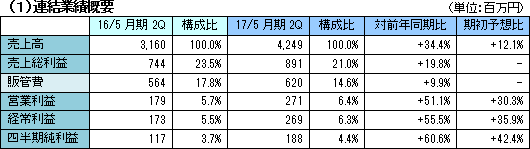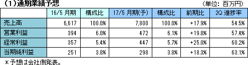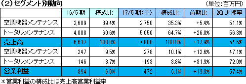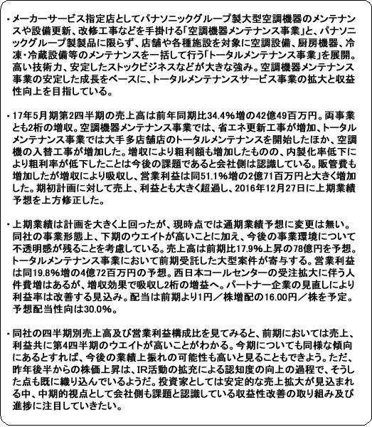 売上高は前年同期比34.4%増の42億49百万円。両事業とも2桁の増収。空調機器メンテナンス事業では、省エネ更新工事が増加、トータルメンテナンス事業では大手多店舗店のトータルメンテナンスを開始したほか、R22冷媒を使用した空調機の入替工事が増加した。増収により粗利額も増加したものの、内製化率低下により粗利率は2.5%低下したことは今後の課題であると会社側は認識している。 販管費も増加したが増収により吸収し、営業利益は同51.1%増の2億71百万円と大きく増加した。 期初計画に対して売上、利益とも大きく超過し、2016年12月27日に上期業績予想を上方修正した。 ![]() ◎空調機器メンテナンス事業