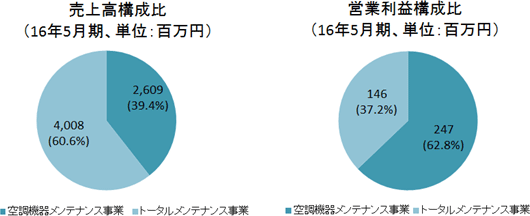 同社の事業は「空調機器メンテナンス事業」、「トータルメンテナンス事業」の2セグメントで構成されている。1.セグメント グラフでもわかるように、売上高ではトータルメンテナンス事業が6割を占めるが、営業利益では空調機器メンテナンス事業が6割を超しており、収益性は空調機器メンテナンス事業が上回っている。 ![]() ①空調機器メンテナンス事業