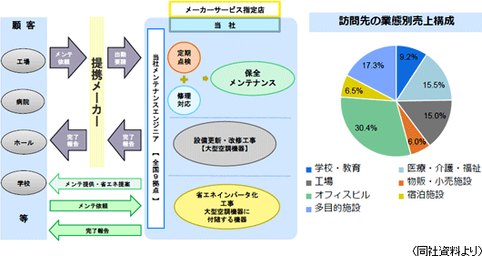 パナソニックグループにおいて業務用設備機器およびシステムの販売・施工・サービスを担っているパナソニック産機システムズ株式会社のメーカーサービス指定店として、同グループが製造・販売した納入先において業務用大型空調機器等の定期点検、修理対応を行っている。近年では大型空調機器に付随した省エネインバータ化工事(※)、大型空調機器以外の電気設備や給排水衛生設備などのメンテナンスも手掛けるほか、大型機器のリニューアルなど事業領域を拡大している。 ![]() ※インバータ化工事