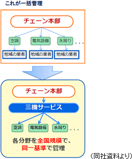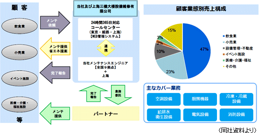 後述するように、空調、冷暖房、厨房などの各種機器を用いる飲食店、小売店においてはデフレ環境下、売上の大幅増が期待しがたい中で、競争を勝ち抜くためにはコスト管理が最重要ポイントとなる。特にチェーン店化を進めている場合、各機器を全国規模・同一基準で管理することによるトータルコストの削減へのニーズが強い。 同社ではトータルメンテナンス事業の市場規模を約3兆円(※)と推定しており、この巨大市場の開拓を積極的に推進していく考えだ。 ※主要顧客3業態(飲食、流通、娯楽関連)の全国チェーン売上高の3%をメンテナンスコストと仮定