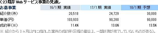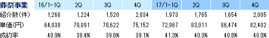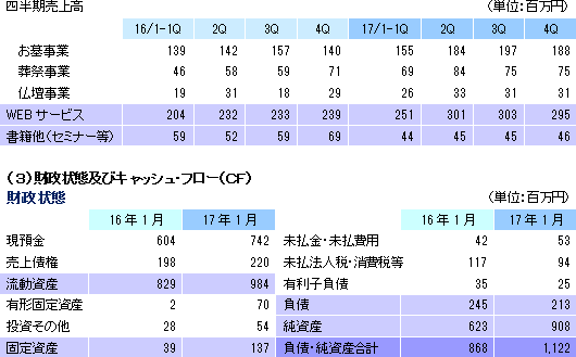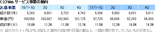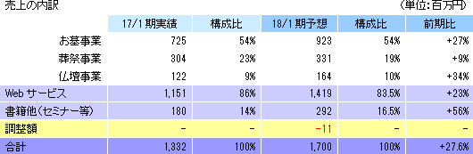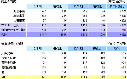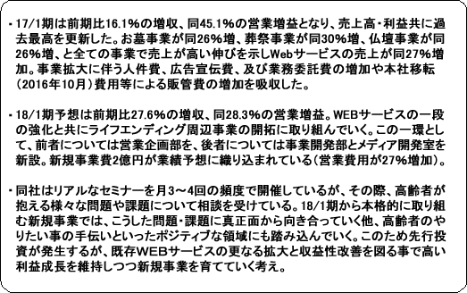 事業は、お墓、葬祭、仏壇等のマッチングプラットフォームとなるポータルサイト運営を中心としたWEBサービス事業と、ライフエンディングに関わる書籍の企画・制作・賑売やセミナー等の書籍他事業に分かれる。17/1期の売上構成比は、WEBサービス事業86%、書籍他事業14%。