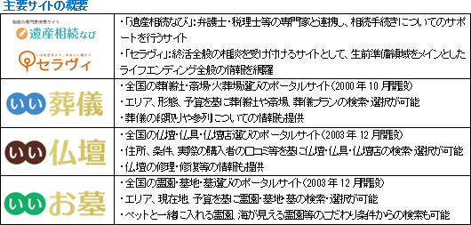 核家族化が進み、前の世代からの慣習や知識等の引き継ぎが減っているため、消費者は、ライフエンディング全般に、「誰に頼めばいいかわからない」、「どうすべきかわからない」、「選ぶ基準がわからない」、「費用が適正かどうかわらない」といった悩みを抱えており、インターネットで情報検索するケースが増えている。一方、事業者は、「集客やセールスのコストがかかり過ぎる」、「信頼感をもたれていない」といった悩みを抱えている。このため、10~20%程度の成功報酬で顧客開拓できる鎌倉新書のポータルサイト活用は魅力的であり、信頼感と言う点では、業界誌の発行体として30年以上の実績を有する同社が仲介する意義は大きい ![]() |