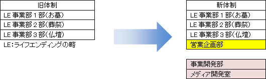 ユーザーへの営業強化(取引先業者のマーケティング支援)を目的に営業企画部を新設した他、ライフエンディング周辺市場での事業展開に向け、事業開発部とメディア開発室を新設した。