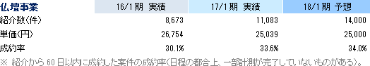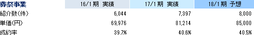 ![]() 上記取り組みの一環として、18/1期期初に、営業企画部、事業開発部及びメディア開発室を新設した。既存事業の最大化とライフエンディング周辺事業の開拓により、圧倒的な知名度とブランド価値の獲得につなげていきたい考え。 組織変更