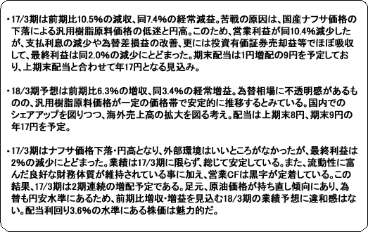 汎用樹脂原料価格については、原油相場の回復基調及び原油生産国の生産調整の流れを受けて一定の価格帯で安定的に推移するとみている。顧客密着型の営業を徹底する事で国内でのシェアアップを図りつつ、海外拠点顧客の海外展開への迅速な対応と海外拠点の有機的な活用により海外売上高の拡大を図る考え。