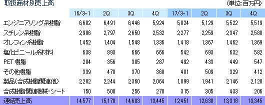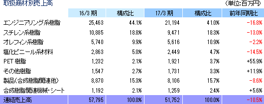 売上高の81.9%がプラスチック原料で(この他、製品15.7%、関連機器・シート2.4%。17/3期)、相対的に単価が高く高付加価値商材であるエンジニアリング系(41.0%)やスチレン系(18.3%)の樹脂原料が中心。エンジニアリング系樹脂原料とはポリアミド樹脂、ポリアセタール、ポリカーボネート等で、用途はOA・事務機器、光学機器(カメラ等)、精密部品(ギア等の機構部品)等。一方、スチレン系樹脂原料とは、ポリスチレンやABS樹脂等で、エアコン、冷蔵庫等の白物家電、パソコン・同周辺機器、FAX、及び玩具等で使われている(この他、家電・医療機器向け等のオレフィン系樹脂10.9%、建材向け等の塩化ビニール系材料4.7%、その他樹脂3.3%、PET樹脂3.7%)。