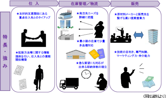 高付加価値商材の拡販の原動力となっているのが、(1)合成樹脂原料に関する高い専門性、(2)商社としてのネットワークを駆使した、メーカーを巻き込んでの提案力、及び(3)顧客との質の高いコミュニケーションが可能とする少量多品種即納体制、の3点。いずれも合成樹脂専門商社に不可欠な要素であり、最もQCDに厳しい日本の優良企業との継続的取引の中で同社が磨き上げてきたコアコンピタンスである。高い専門性を背景にメーカーと一体となって提案営業を進める事でビジネスを広げ、少量多品種の即納対応及び顧客密着型の営業展開で顧客満足度を高めている。