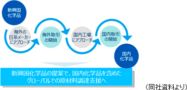 得意先及び仕入先企業は、常に新商品開発、商品リニューアルにおいて、価格、品質、機能、作用及び環境負荷等で課題を抱えており、自社と外部のアイデア等を組み合わせて革新的な価値を創出するオープン・イノベーションを志向する企業が増加している。そうした事業環境を同社ではビジネスチャンスと捉え、各社の開発テーマや製造上の課題をヒアリングしたうえで、長年にわたって蓄積してきたオレオケミカルおよび界面活性剤に関する豊富な知見・知識を活用して新商品開発の支援を行っている。 具体的な支援としては、商品企画アイデアの提案、商品の特長となる効果に適切な原材料の選定、得意先の要望を踏まえた上でのより効率的な仕入先や生産委託先の選定、仕入先の共有による原材料コストの低減など。 例えば仕入先の工場が事故などで操業停止した際の代替品の調達も可能であり、得意先からは無くてはならない存在となっている。 商品の仕入販売という単なる商社機能の枠を超えた製品開発支援により顧客企業との強固な信頼関係が構築されており、同社の大きな競争優位性となっている。 ◎グルーバルに顧客企業の生産活動を支援