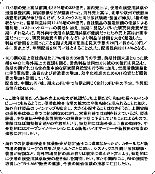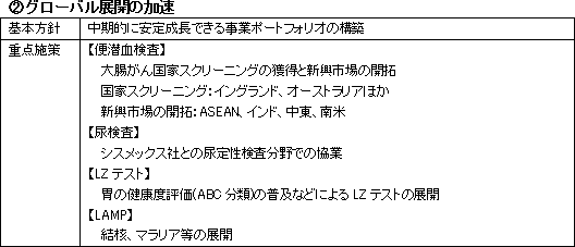 2014年の世界の検体検査薬・機器市場は約560億USDといわれており、地域別構成比は米国42%、欧州33%、アジア・パシフィック22%などとなっている。市場規模自体が国内市場の10倍超と巨大であると同時に、先進国では高齢化の進展に伴う検査数の増加、また新興国においては経済成長、所得増加に伴う医療ニーズの拡大などにより、年率7~8%と国内市場を大きく上回る成長が見込まれるため、国内企業は積極的にグローバル化を進めている。 ただ、グローバル市場においては、ロシュ、アボット、シーメンス、ベックマンなど売上高が2,000~9,000億円にも上る世界的大企業がメインプレーヤーとなっており、日本企業が競争に勝ち抜くためには独自性のある製品・システムの開発など競争力強化が不可欠である。 【事業内容】