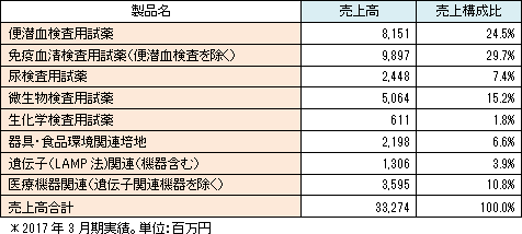主として以下の各検査用試薬や測定装置を製造・販売している。同社は幅広い検査薬を取り扱うために、自社製品に加え他社製品の仕入販売も行っている。 主要な自社製品は、便潜血検査用試薬、微生物検査用試薬、免疫血清検査用試薬、尿検査用試薬、遺伝子検査用試薬など。自社製品と他社製品の売上比率は約60:40。粗利率は自社製品が約55%、他社製品が約35%。 ![]() 便潜血検査用試薬