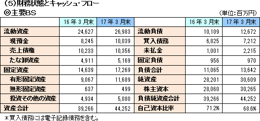 FINDと共同開発したLAMP法による「Loopamp結核菌群検出試薬キット」と「LoopampPURE DNA抽出キット」および測定装置「Loopamp蛍光測定部付恒温装置 LF-160」を使用した結核遺伝子検査法(TB-LAMP)が、その評価結果を認められ、WHOの推奨を取得した。今後、販売契約を提携した独HUMAN社と、LAMP法による結核遺伝子検査薬・測定装置ならびにマラリア遺伝子検査薬・測定装置の海外市場(中国、韓国、台湾、タイは除く)開拓を進める。 ![]() 建物・構築物の償却方法を、定率法から定額法に変更した。 ![]() 買入債務、未払金の増加などで流動負債は同25億63百万円増加し、固定負債はほぼ変わらず、負債合計は同25億77百万円増加の136億42百万円となった。 純資産は利益剰余金増などで同24億8百万円増加の306億9百万円となった。この結果、自己資本比率は前期末の71.2%から68.6%へ2.6%低下した。 ![]() |