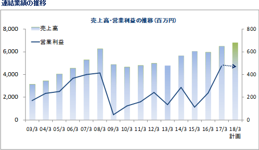 中期経営方針として、①既存事業の質・量の持続的成長、②新市場・新分野への事業展開、③2020年に向けた事業基盤の強化と整備と定め、最終年度である17/3期に数値目標である、売上高80億円、営業利益8億円の達成を目指す内容といていた。しかし、同社は、ライフサイエンス分野のマイクロ流体デバイス製品について、最終年度の連結売上高目標を12.5億円としていたものの売上比率を高く設定していた主力案件の受注が大幅に少なくなる見込みとなったことや、他の開発案件の量産開始も遅れる見込みとなったことにより、2016年2月23日に第11次中期経営計画(V-1計画)の見直しを発表した。