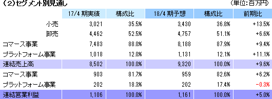 事業は、コマース事業、プラットフォーム事業、及び18/4期から区分したその他(コマース事業、プラットフォーム事業のいずれにも明確に分類できない新たなサービスに係るもの)に分かれる。17/4期の売上構成比は、コマース事業88.0%、プラットフォーム事業12.0%だが、営業利益の構成比は、それぞれ81.7%、18.3%。