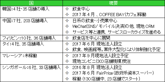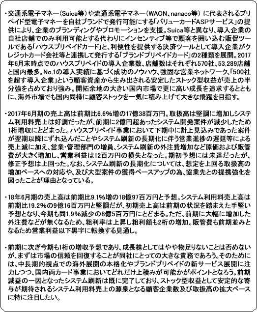 ![]() 前期、取扱高は前期比倍増し、システム利用料売上も3割増とストック収入の積上げは堅調。今期も取扱高は順調な立ち上がりとなっている。 また、大型飲食チェーンを中心に足元の新規案件受注も堅調に推移している。 <今期の取り組み> 主要KPIである取扱高及び導入店舗数などの成長を促進する。 ①営業アライアンスの強化 2017年6月期はパートナー企業であるPOSベンダー企業との提携により受注した新規スーパー等20社が本格稼働(取扱高約59億円で、年間の約3分の1を創出)するなど大きな成果を上げることができた。 今期もPOSベンダーを中心としたパートナー企業との営業アライアンスの強化に加え、新規開拓も進め、大型案件獲得力をさらに強化する。 ターゲットは引続き大型のスーパー・ドラッグストア・飲食チェーン等としている。 ②ソリューション商品の拡充 販促の効率化や導入負荷を軽減し、有効なプリペイドサービスの活用を支援するためのソリューション商品を投入・拡販し、取扱高増進を図る。 ![]() ブランドプリペイドカードが普及している米国では、単に決済手段のみでなく、給与受取や税金還付など、使い方はきわめて多岐にわたっている。 日本でもポイント等の資産の活用手段や資金移動などの用途拡大に伴い市場成長が予測される中、新たなブランドプリペイドのサービス提供に向けた検討を継続していく。 ハウスカード延長型やポイント等、埋蔵資産の有効活用サービスにおいては10%前後のシェアを獲得するなど着実に実績を積み上げている。 ![]() 韓国のCOFFEE BAY(カフェチェーン・450店舗)、シンガポールのFairPrice(政府系資本スーパー・130店舗)が稼働し、タイ、マレーシアでもコンビニや書店など、提案先がローカル大手企業へと変化している。 一方、中国、香港、台湾、インドネシア、タイで競合の存在を確認した。東南アジアのハウスプリペイド市場成長が加速を始めていると考えている。 <今期の取り組み> 東南アジアビジネスの投資による更なる推進と強化を図る。株式会社ティーガイア(3738、東証1部)と連携し、子会社の増資や体制強化を行うとともに、ローカル大手企業への提案と獲得を進める。 また、アジア全域で同業各社と積極的に情報交換を行い、業務・資本などの提携やM&A等も積極的に推進し早期拡大を図る。 ![]() ティーガイア及び住友商事グループのネットワークを活用した、ローカル大手企業への営業力を強化する。中・大規模(30~100店舗以上)のローカル企業を今後のターゲットとする。 現在、コンビニ(300店舗規模)、小売(400店舗規模)等へアプローチを行っている。 |