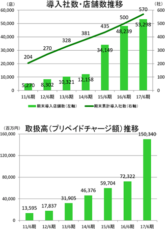 クレジットカード会社で新たな決済手段の開発に取り組んでいた尾上社長は、アメリカでサーバー管理型電子マネーである「ハウスプリペイド」、「ブランドプリペイド」が普及・拡大していることを知り、数年後にはその波が日本にも必ず到来することを予想。いち早く導入に動くが、当該クレジットカード会社では既に非接触IC型電子マネーへの取り組みが中心となっていたため、新たにサーバー管理型電子マネーを手掛けるための人員も予算も不足しており、導入を進めることは難しいのが現実であった。そうした中、尾上社長は、成長が見込まれる「ハウスプリペイドカード」、「ブランドプリペイドカード」を日本で是非とも事業化したいと考えクレジットカード会社を退社し、2006年7月に同社を設立した。 「ハウスプリペイドカード」という文化が無い日本で当初営業活動は苦戦したが、低価格の専用端末を武器に店舗数10店舗程度の小規模事業者を中心に顧客数は着実に増加し、一定のシェアを獲得する。ハウスプリペイドカードマーケットの拡大に伴いシェアは一段と上昇し、顧客規模も中堅、大手へと拡大していった。 2012年からは海外でも事業を展開。2016年9月、東証マザーズに上場した。 ![]() 【1-2 経営理念など】