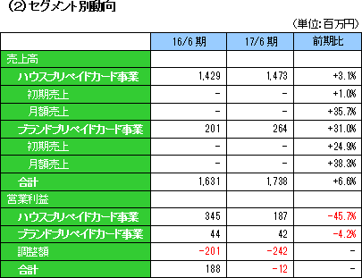 増収減益。年間売上高1,000億円規模の大型スーパーマーケット・ドラッグストア・飲食店などサービス導入済企業におけるプリペイドカードへの入金・利用は活発で、取扱高は前期比107.8%増の1,503億40百万円と大幅に増加。月額売上であるシステム利用料売上は前期比35.7%の増収だった。 ただ、 一方、国内・海外の営業部門等の増員に伴う人件費と諸経費の増加、システム利用料売上の伸長に伴う代理店手数料の増加、事業拡大に伴い営業・管理部門へ外部より支援要員を投入した事による業務委託費の発生等の要因によりコストが大幅に増加し、セグメント利益は大幅な減益となった。 ②ブランドプリペイドカード事業