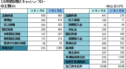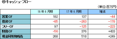増収減益。既存顧客であるカード発行会社の新たな提携先における取扱高が増加。それに伴いシステム利用料売上は前期比38.3%増加した。 新たなカード発行会社へのサービス提供も始まり、新規のブランドプリペイドカードが発行された。このカード発行会社専用のブランドプリペイドの発行管理システムの新規開発、及びその他既存カード発行会社向けの提携先追加によるシステムカスタマイズ等の案件により、初期売上は同24.9%増加した。 一方で、新規カード発行会社向けのシステムにおいてサービス稼働後の運用コストが想定を上回ったこと、初期売上の原価率が前期に比べ上昇したこと等により、外注費等の売上原価が同40.1%増加したことから、営業利益は減益となった。 ![]() 仕入債務、未払金の減少で流動負債は同1億64百万円の減少。負債合計は同1億65百万円減少の5億22百万円。 資本金、資本準備金の増加で純資産は同4億97百万円の増加。 この結果、自己資本比率は前期末に比べ30.5%上昇し、60.0%となった。 ![]() システム開発に伴い固定資産の取得による支出が増加し投資CFのマイナス幅は拡大し、フリーCFはマイナスに転じた。 株式の発行により財務CFはプラスに転じた。 キャッシュポジションは上昇した。 (4)当期の課題と今期の改善方針及び展望