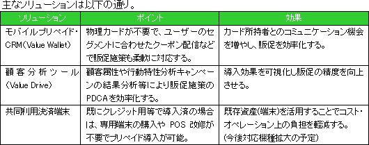 自社ブランドによるプリペイドカード発行を希望する企業に対して同社が自社開発したサーバー管理型プリペイドカードシステム「バリューカードASPサービス」を提供している。「バリューカードASPサービス」導入企業は、専用端末を設置するのみで、ハウスプリペイドカードシステムの導入が可能である。 ハウスプリペイドカードの概要、導入企業および消費者のメリットは以下の通り。 ![]() 即ち、バリューカードASPサービスにより提供するプリペイドサービスを効果的に活用し、導入企業の客数・来店頻度・客単価などの指標の上昇、売上向上への貢献を目指す点が同社の大きな特徴である。 もちろん多様化する決済手段を最適化するとともに、店舗、消費者双方の決済に係る利便性向上にも貢献している。 ~販促支援活動~