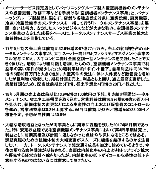空調機器メンテナンス事業は、顧客が基本的にはパナソニック産機システムズ1社のみであるため急速な成長を望むことはできないが、定期点検や修理等、安定した売上の拡大を見込むことができる。また新規参入による価格競争が起こる可能性も低く、安定した利益率を維持している。