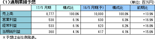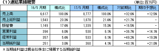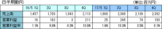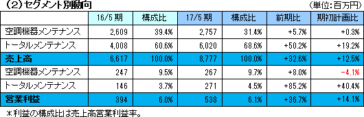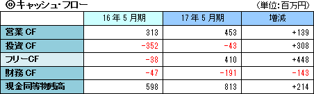 大幅な増収・増益24時間365日稼働のコールセンターを核としたサービスを、多店舗・多棟に展開している飲食業、小売業、イベント施設、医療・介護・福祉施設等の幅広い業界をターゲットとして日本全国で展開した。 上場による認知度向上や全国エリア対応、メンテナンス範囲の拡大を強みとして管理コストの見直しを進めている企業の需要を掘り起こすことに注力した結果、大型食品スーパー(2016年4月取引開始)、大手コンビニエンスストア(同年10月取引開始)など大口案件が増加している。 また、業務範囲を警備業などのファシリティマネジメント分野に拡大したことも増収に寄与。加えて定期メンテナンスの売上構成比上昇により利益率も上昇した。 一方、大手コンビニ向けメンテナンス対応のための体制づくりに注力した結果、第4四半期の空調メンテナンス受注量は減少し、営業利益は計画を下回った。 両事業における上記のような要因により、第4四半期は営業減益となり、営業利益率も16年5月期第4四半期を下回った。 この課題に対し、同社では後述のように今期より組織体制を営業本部とメンテナンス本部から構成される「機能別組織」に変更し、生産性の向上を図る考えだ。 ![]() ![]() 工事未払金の増加などで負債合計は同1億円増加の17億74百万円となった。 利益剰余金の増加などで純資産は同2億75百万円増加の16億97百万円となり、自己資本比率は前期末より3.0%上昇し48.9%となった。 ![]() 有形固定資産の取得額の減少等で投資CFのマイナス幅は縮小。フリーCFはプラスに転じた。 配当金支払額増加などで財務CFのマイナス幅は拡大した。 キャッシュポジションは上昇した。 (4)トピックス