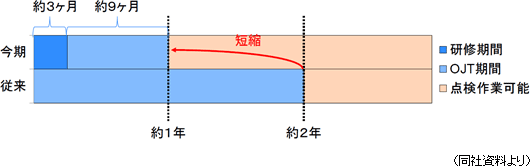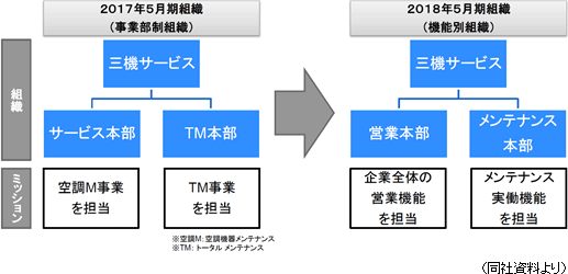 今期より事業部単位で営業、メンテナンス機能を保有する「事業部制組織」から、営業本部とメンテナンス本部から構成される「機能別組織」に変更することとした。流動的にサービスマンを活用し多能工化の推進力を高めることに加え、営業担当者間での情報共有を活性化し対応力を高めることを通じて生産性の向上を目指す。 ![]() ◎研修体制の充実