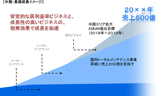 安定的な成長と高い収益性を有する「メーカーメンテナンス」をベースに、成長性の高い「トータルメンテナンス」、「海外ビジネス」を積極的に展開し、成長を加速させる。国内トータルメンテナンス事業を中心に早期の売上高200億円達成を目指し、その後、500億円の実現を目指していく。 中国ではトータルメンテナンスが着実に拡大している。顧客層は従来の日系企業に加え、現地企業や外資系企業へと広がりを見せている。 ASEANに関しては、シンガポール、台湾、タイ、ベトナム、マレーシアの5か国を対象に市場調査を行っている。 営業、メンテナンス両面に関してのパートナーの選別を進めており、2018~2019年の進出を目指している。 ![]() |
