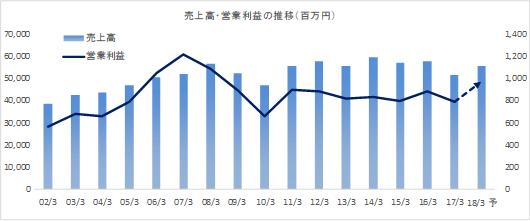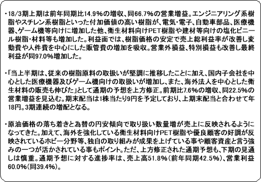 「当上半期は、従来の樹脂原料の取扱いが堅調に推移したことに加え、国内子会社を中心とした医療機器及びゲーム機向けの取扱いが増加し、また、海外法人を中心とした衛生材料の販売も伸びた」として通期の予想を上方修正した。期末配当は1株当たり9円を予定しており、上期末配当と合わせて年18円。3期連続の増配となる。 ![]() |