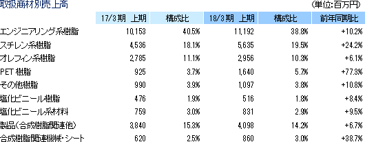 2017年3月期における売上高の81.9%がプラスチック原料で(この他、製品15.7%、関連機械・シート2.4%。17/3期)、相対的に単価が高く高付加価値商材であるエンジニアリング系(41.0%)やスチレン系(18.3%)の樹脂原料が中心。エンジニアリング系樹脂原料とはポリアミド樹脂、ポリアセタール、ポリカーボネート等で、用途はOA・事務機器、光学機器(カメラ等)、精密部品(ギア等の機構部品)等。一方、スチレン系樹脂原料とは、ポリスチレンやABS樹脂等で、エアコン、冷蔵庫等の白物家電、パソコン・同周辺機器、FAX、及び玩具等で使われている(この他、家電・医療機器向け等のオレフィン系樹脂10.9%、建材向け等の塩化ビニール系材料4.7%、その他樹脂3.3%、PET樹脂3.7%)。2017年3月期における販売先業界別の構成比は、日本メーカーが圧倒的な強みを持つ事務機器・OA・光学機器向けが39.3%、スチレン系・オレフィン系が中心の家電(白物家電)・電子(PC・周辺機器)向けが14.5%、オレフィン系のポリプロピレン等の医療機器向け9.3%、塩化ビニール系材料が中心の建材7.5%、自動車4.2%、ホビー3.8%、パッケージング2.8%、衛材2.7%、その他15.9%。 重点仕入先と仕入商品及び用途