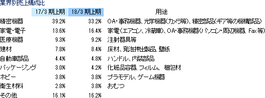 尚、同社の顧客は、精密機器、医療機器、家電・電子等の勝ち組企業が多く、いずれの顧客も国内外での生産バランスに配慮した経営を行っている。このため、国内でも取引の拡大余地を残している。 |