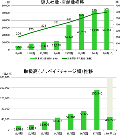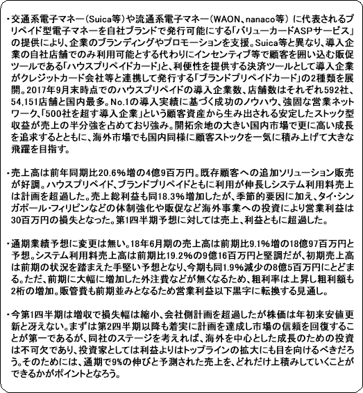 ![]() 前期、取扱高は前期比倍増し、システム利用料売上も3割増とストック収入の積上げは堅調。今期も取扱高は順調な立ち上がりとなっている。 また、大型飲食チェーンを中心に足元の新規案件受注も堅調に推移している。 <今期の取り組み> 主要KPIである取扱高及び導入店舗数などの成長を促進する。 ①営業アライアンスの強化 2017年6月期はパートナー企業であるPOSベンダー企業との提携により受注した新規スーパー等20社が本格稼働(取扱高約59億円で、年間の約3分の1を創出)するなど大きな成果を上げることができた。 今期もPOSベンダーを中心としたパートナー企業との営業アライアンスの強化に加え、新規開拓も進め、大型案件獲得力をさらに強化する。 ターゲットは引続き大型のスーパー・ドラッグストア・飲食チェーン等としている。 ②ソリューション商品の拡充 販促の効率化や導入負荷を軽減し、有効なプリペイドサービスの活用を支援するためのソリューション商品を投入・拡販し、取扱高増進を図る。 ![]() ブランドプリペイドカードが普及している米国では、単に決済手段のみでなく、給与受取や税金還付など、使い方はきわめて多岐にわたっている。 日本でもポイント等の資産の活用手段や資金移動などの用途拡大に伴い市場成長が予測される中、新たなブランドプリペイドのサービス提供に向けた検討を継続していく。 ハウスカード延長型やポイント等、埋蔵資産の有効活用サービスにおいては10%前後のシェアを獲得するなど着実に実績を積み上げている。 ![]() 韓国のCOFFEE BAY(カフェチェーン・450店舗)、シンガポールのFairPrice(政府系資本スーパー・130店舗)が稼働し、タイ、マレーシアでもコンビニや書店など、提案先がローカル大手企業へと変化している。 一方、中国、香港、台湾、インドネシア、タイで競合の存在を確認した。東南アジアのハウスプリペイド市場成長が加速を始めていると考えている。 <今期の取り組み> 東南アジアビジネスの投資による更なる推進と強化を図る。株式会社ティーガイア(3738、東証1部)と連携し、子会社の増資や体制強化を行うとともに、ローカル大手企業への提案と獲得を進める。 また、アジア全域で同業各社と積極的に情報交換を行い、業務・資本などの提携やM&A等も積極的に推進し早期拡大を図る。 ![]() ティーガイア及び住友商事グループのネットワークを活用した、ローカル大手企業への営業力を強化する。中・大規模(30~100店舗以上)のローカル企業を今後のターゲットとする。 現在、コンビニ(300店舗規模)、小売(400店舗規模)等へアプローチを行っている。 |