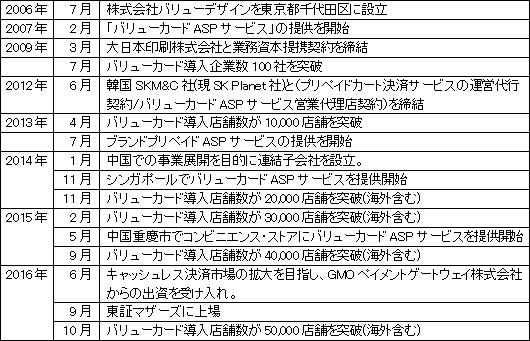 クレジットカード会社で新たな決済手段の開発に取り組んでいた尾上社長は、アメリカでサーバー管理型電子マネーである「ハウスプリペイド」、「ブランドプリペイド」が普及・拡大していることを知り、数年後にはその波が日本にも必ず到来することを予想。いち早く導入に動くが、当該クレジットカード会社では既に非接触IC型電子マネーへの取り組みが中心となっていたため、新たにサーバー管理型電子マネーを手掛けるための人員も予算も不足しており、導入を進めることは難しいのが現実であった。そうした中、尾上社長は、成長が見込まれる「ハウスプリペイドカード」、「ブランドプリペイドカード」を日本で是非とも事業化したいと考えクレジットカード会社を退社し、2006年7月に同社を設立した。 「ハウスプリペイドカード」という文化が無い日本で当初営業活動は苦戦したが、低価格の専用端末を武器に店舗数10店舗程度の小規模事業者を中心に顧客数は着実に増加し、一定のシェアを獲得する。ハウスプリペイドカードマーケットの拡大に伴いシェアは一段と上昇し、顧客規模も中堅、大手へと拡大していった。 2012年からは海外でも事業を展開。2016年9月、東証マザーズに上場した。 ![]() 【1-2 経営理念など】