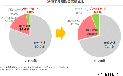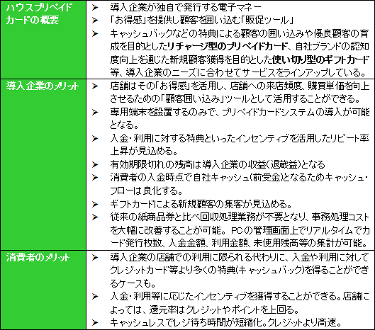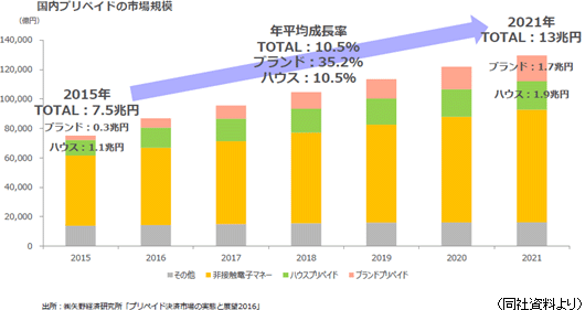 高い安全性、効率性の向上といった発行者、利用者双方のニーズから、「現金決済比率の低下、電子決済のウェート拡大」が続いている。中でもプリペイドカードは今後も更なる伸長が見込まれている。 ![]() 中でもハウスプリペイドカードは2015年度から2021年度までの年平均成長率は10.5%で市場規模は1.9兆円に拡大。ブランドプリペイドカードは同じく年率35.2%成長で1.7兆円へと、市場平均を大きく上回る高成長が見込まれている。(いずれも矢野経済研究所調べ。) ![]() ◎プリペイド決済の種類