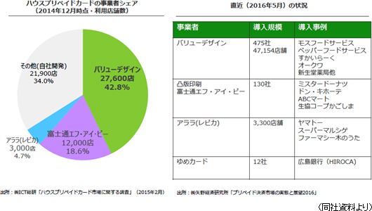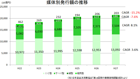 プリペイドによる決済には以下のような種類がある。同社の「バリューカードASPサービス」はサーバー管理型プリペイドカードシステムにあたる。 ![]() 一般社団法人日本資金決済業協会の調査によれば、前払式支払手段(プリペイド)の媒体別年間発行額合計は、平成27年度 21.5兆円で、過去5年間の成長率は年率4.2%。媒体別には発行額が最多だったのはIC型だが、磁気型や紙型が減少傾向にあるのに対し、最も伸長したのはサーバー型だった。 上記のようなサーバー管理型電子マネーのメリットを発行者が評価した結果と言えるだろう。 企業が費用対効果を追求する姿勢をますます強める中、顧客囲い込みのための有力な手段としてサーバー管理型電子マネーを用いたプリペイドカード需要は今後も引き続き増大していくものと思われる。 ![]() ◎同業他社