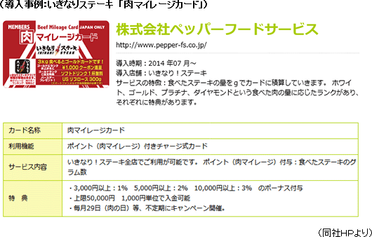 いきなり!ステーキは、お肉をお客様の前でお好みの量にカットして召し上がっていただくというスタイルです。いきなり!ステーキ第1号店が2013年12月5日に銀座でOPENして以来、リピーターのお客様からご自身が食べてきた記録を残したいという声が多くあがり、かねてから一瀬社長が構想していた飛行機のマイレージのようなものができないか?という案が具体化されました。導入にあたっては、食べた量を目でみることができるリライト式や通常のポイント仕組み等、複数社が候補にあがりましたが、せっかく持って頂くなら高級感のあるカードが良いということと、将来的にチャージができるということに魅力を感じ、バリューデザインに決めました。 導入された結果、どのような変化がありましたか?