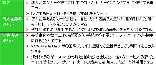自社の独自ブランドで発行が可能な「ハウスプリペイドカード」と、VISA、MasterCardを始めとする国際ブランドと提携し、従来のハウスプリペイドカードの機能にVISA、MasterCard等の国際ブランド加盟店での決済機能を搭載した「ブランドプリペイドカード」を展開しており、この2つを事業セグメントとしている。