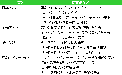 プリペイドカードサービス成功の鍵はシステムではなく利用を促進するノウハウであると同社では考えている。この点で、10年間で蓄積した豊富な導入事例は大きなアドバンテージとなっている。 様々な業種からなる500社を超す導入実績から具体的な事例を用いて個社ごとの最適な手法を提案することができる点は他社にはない強力な差別化要因であり、現在までのさらに将来に向けての同社成長の源泉でもある。 ![]() ②専門のコンサル部門による導入・運用支援