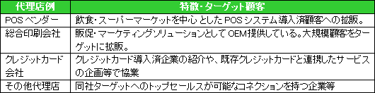 同社ではプリペイドカード事業は先行者利益の大きいビジネスと捉えており、早急なシェア(=導入企業数)獲得が重要と考えている。そのため、同社ではターゲット先の業態や企業に対して業務上深い関連性を持つ企業(POSベンダーやトップセールスが可能な有力企業等)と販売代理店契約を締結し、全国各地を網羅した営業ネットワークを構築している。