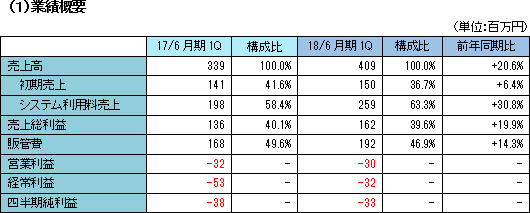 売上高は前年同期比20.6%増の4億9百万円。既存顧客への追加ソリューション販売が好調。ハウスプリペイド、ブランドプリペイドともに利用が伸長しシステム利用料売上は計画を超過した。売上総利益も同18.3%増加したが、季節的要因(※)に加え、タイ・シンガポール・フィリピンなどの体制強化や販促など海外事業への投資により営業利益は30百万円の損失となった。 第1四半期予想に対しては売上、利益ともに超過した。 (※)ハウスプリペイドカード事業の主要顧客である飲食業・小売業は繁忙期である夏季商戦や年末商戦を見据えてシステムを導入するケースが多く見られることから、同社の売上高も夏季商戦直前の第4四半期(4-6月)がピークとなり、それを過ぎた第1四半期(7-9月)はその反動で、サービス稼働案件が少なくなる傾向がある。