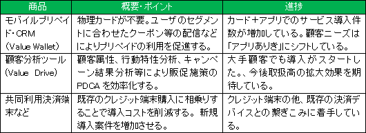 増収増益。前期プリペイドサービスの利用が活発だった大手飲食チェーン、スーパーマーケット、ドラッグストアでのサービス利用が引き続き増加し、取扱高は前年同期比58.6%増の49億円となった。 また、販売代理店との連携によりスーパーマーケットやホームセンター業態等での新規受注が継続しており、導入店舗数は累計で同11.1%増の54,151店となった。 (追加ソリューション商品の拡充) 同社では導入時の課題解決による顧客満足度の向上や導入後の利用促進につながる商品・サービスをラインナップしている。が、モバイルアプリ、分析ツール等の導入は想定より進んでいる。 ![]() ②ブランドプリペイドカード事業