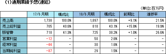 通期業績予想に変更は無い。売上高は前期比9.1%増の18億97百万円と予想。システム利用料売上高は前期比19.2%の9億16百万円と堅調だが、初期売上高は今期も同1.9%減少の8億5百万円にとどまる。ただ、前期に大幅に増加した外注費などが無くなるため、粗利率は上昇し粗利額も2桁の増加。販管費も前期並みとなるため営業利益以下黒字に転換する見通し。 前期の業績大幅未達を受けて不確実性の高い要素は排除しつつ、安定的な増収を確保するため、投資のサイクルを確立すべくシステム利用料売上の増加施策に注力する。 |
