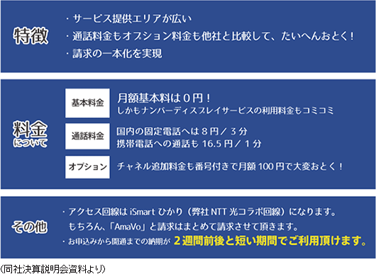 新たに提供を開始したサービスであり、iSmartひかり(同社NTT光コラボ回線)専用の法人向け電話サービス。同社が新たに開始したIP電話の「新しいあたりまえ」。AmazingVoIP(驚くべきVoIPサービス)の頭文字をとってネーミングされた。