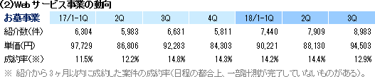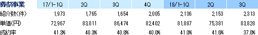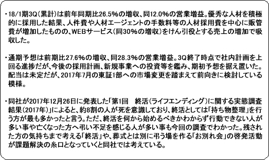 成長を加速するための体制強化を念頭に、①葬祭事業責任者に元Rakuten.comのプレジデント招聘によるマネージャー陣の補強、②全社横断の開発室を設置、③元ベイン・楽天の事業推進室長の下、中長期戦略・アライアンス・M&A戦略・PR戦略の立案、及び④収益に直結する営業企画(アウトバウンド機能)の採用継続、4つの施策を進めている。①により、葬祭事業は、売上、紹介数、成約数が、それぞれ過去最高を更新し、成長率も顕著に改善傾向を示している。②の効果で、有能なエンジニアの採用に成功した他(開発した資産については、計画に基づき資産化を行うため、利益率を毀損する事はない)、業務委託からの社員化にも取り組み人材の拡充が進んでいる。また、バックエンドやUI/UX(ユーザーインターフェース/ユーザーエクスペリエンス)強化等、ユーザビリティを高め、業績向上に直結するプロジェクトも開始した。③により、第3四半期はメディアリレーションが前年同期比2.5倍に、媒体露出が同1.8倍に拡大した。また、複数の出資、買収案件を検討中である。中長期戦略については、次回決算発表の公開を予定している。④はお墓事業の売上増に寄与した。 (4)トピックス 「いい葬儀」(累計相談数30万件以上)が総合満足度でNo.1を獲得!