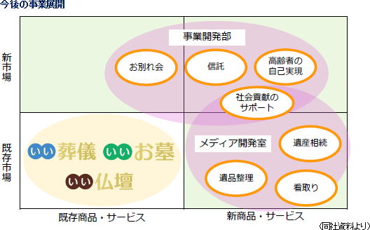 上記取り組みの一環として、18/1期期初に、営業企画部、事業開発部及びメディア開発室を新設した。営業企画部はユーザーへの営業強化(取引先業者のマーケティング支援)に取り組み、事業開発部とメディア開発室はライフエンディング周辺市場で事業展開していく。事業開発部は、お別れ会(葬儀は一線を画す、人々の意識の多様化に対応した新しいお別れの形をプロデュース)、信託、更には、ライフヒストリーやメッセージの作成といった高齢者の自己実現等のニーズを取り込む事で新市場や新商品・新サービスの開発につなげていく。一方、メディア開発室は、遺産相続、遺品整理、看取り等の、新市場や新商品・新サービスの開発に取り組む。また、事業開発部とメディア開発室が連携して社会貢献のサポートにも取り組んで行く。 |