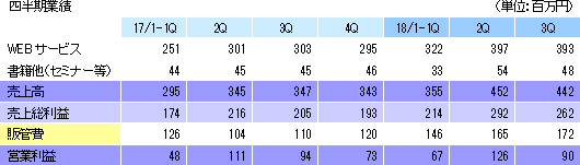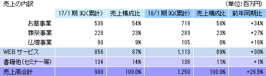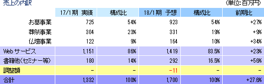 事業は、お墓、葬祭、仏壇等のマッチングプラットフォームとなるポータルサイト運営を中心としたWEBサービス事業と、ライフエンディングに関わる書籍の企画・制作・賑売やセミナー等の書籍他事業に分かれる。17/1期の売上構成比は、WEBサービス事業86%、書籍他事業14%。