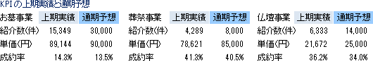 終活から葬儀、仏壇、墓、遺産相続といったライフエンディング全域をカバーするポータルサイト群を通してサービスや商品の情報を発信すると共に、お客様センターで問合せや相談に応じる事で、サイト利用者の意思決定をサポートしている。一方、ポータルサイトに掲載される葬儀社、仏壇仏具店、石材店、寺院霊園等の事業者に対しては、販売支援サービスの提供や掘り起こした見込み客の紹介を行う。サイト利用者には無料でサービスを提供し、紹介した見込み客と事業者との間で契約がまとまった時に成約報酬を受け取る(成約金額の10~20%程度)。事業者にしてみれば、“後払いの広告宣伝費”と考える事ができ受け入れやすい。同業者としては、葬儀サービスでは、流通大手イオングループのイオンライフ(株)、「小さなお葬式」や「葬儀本.com」等を展開する(株)ユニクエスト・オンライン等があり、墓では、「もしもドットネット」を運営する首都圏石材協同組合、メモリアルアートの大野屋、(株)日本仏事ネット等を挙げる事ができる。市場規模は、葬儀市場が1兆4,000億円、仏壇仏具が1,639億円。 KPI(重視する経営指標) 成約報酬 = 紹介数 × 成約率 × 販売単価 × 手数料率
