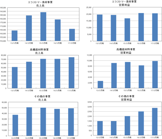 好調な業績動向を反映し、通期予想を再度上方修正した。18年3月期の売上高は前期比474億円、16.5%増加の3,350億円の予想。エラストマー素材がさらに伸びる。営業利益は同82億円、26.8%増加の390億円の予想。電池材料、光学フィルムが好調な高機能材料、建設機械やシェールガスのリグ向けに需要旺盛なエラストマー素材ともに伸長。 当期純利益は前述の減損損失計上で下方修正。各種前提は据え置き。 配当予想に修正は無く、前期比1円増配の17.00円/株。予想配当性向は29.0%。 |
